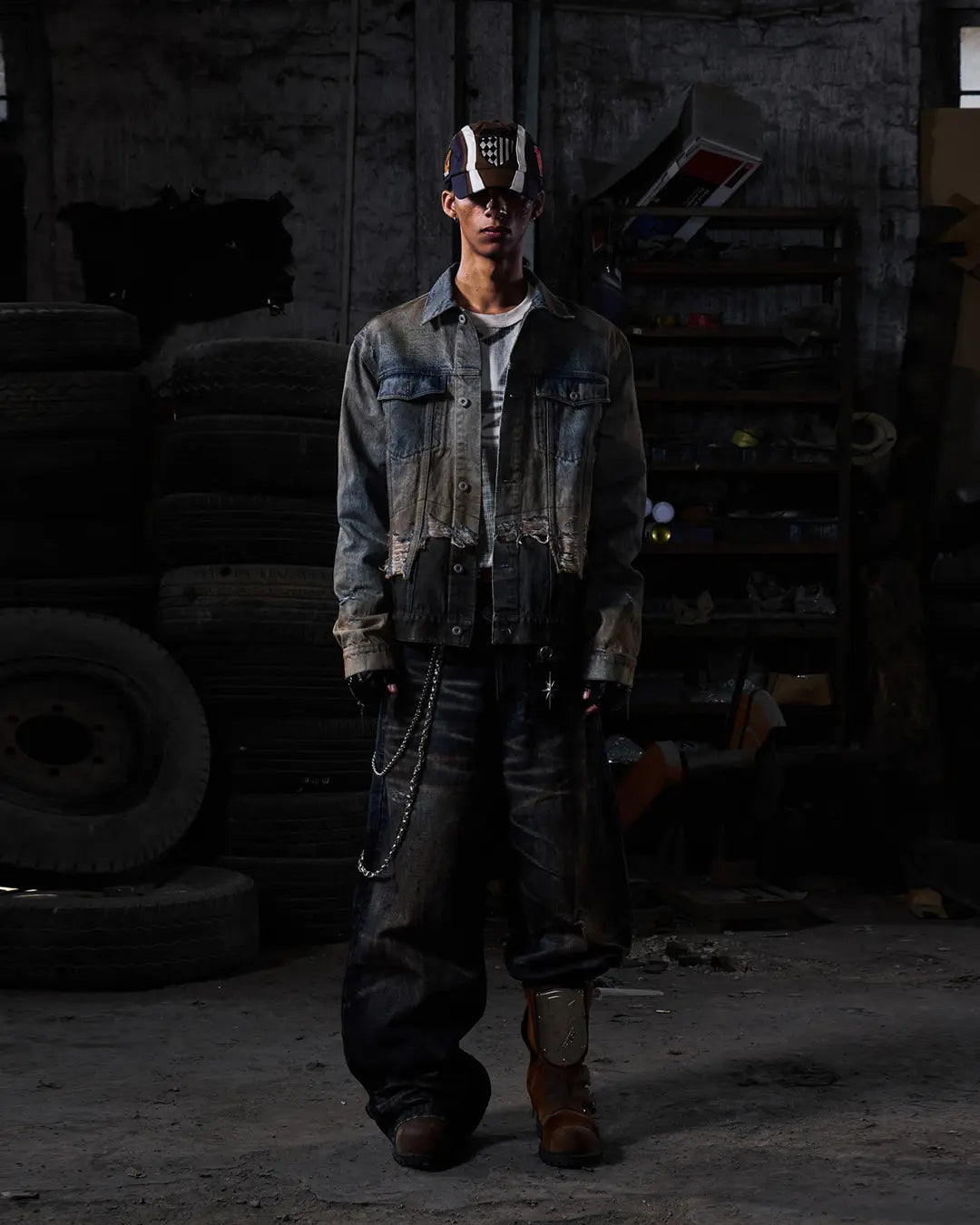 Q2: How is the unique "aged" visual effect achieved? A2: The jacket features a bold two-tone spliced wash. The upper section is light-washed with a nostalgic "monkey wash" (sandblasting) effect, while the lower section remains a deep indigo. We utilized hand-wiping and "dirty" distressing to create a seamless, natural transition, giving the piece an authentic, time-worn patina.